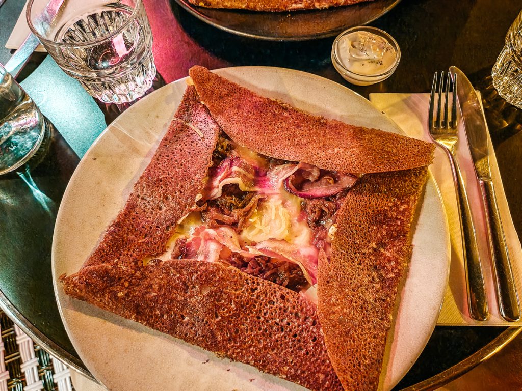 Galettes are one of the most well-known foods from Brittany. They’re similar to crêpes but made with buckwheat flour, which gives them a darker color and a slightly nutty taste. They were originally an affordable alternative to bread and cooked on a large, flat griddle called a galetière.