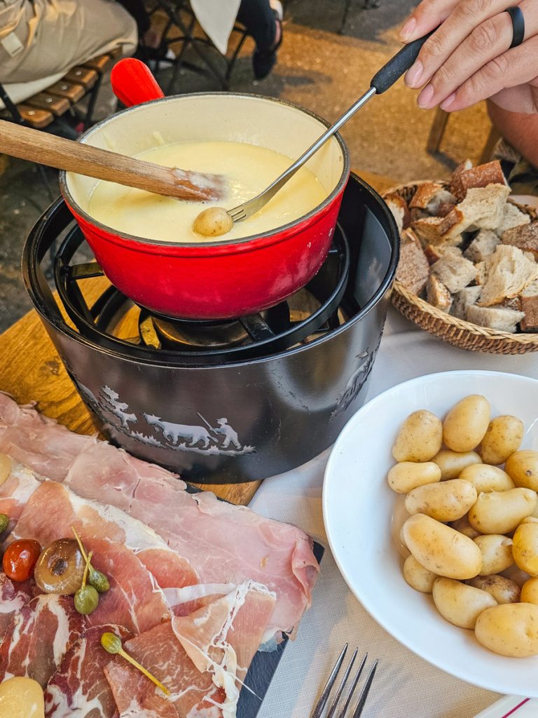 It’s a social dish meant to be shared, with the pot kept warm at the table, and everyone dipping chunks of bread or potatoes into the melted cheese using long forks.