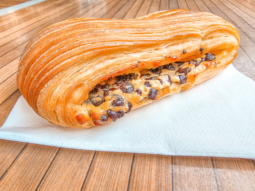 Instead of being rolled into a crescent shape, the dough is rolled up with raisins and a light slather of pastry cream. Typically, you pull apart the circle of dough as you eat it, each bite getting a bit of crispy bread, creamy filling, and sweet raisin.