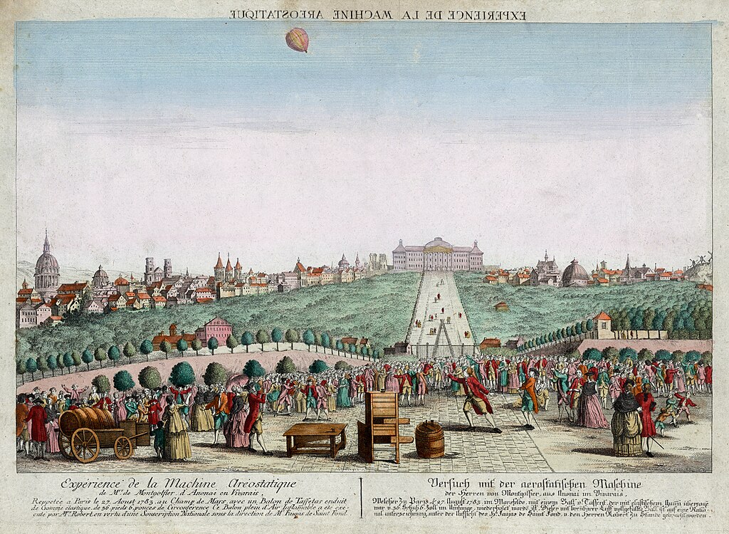 In 1783, brothers Joseph-Michel Montgolfier and Étienne Montgolfier launched the first hot air balloon flight at Versailles, in front of Louis XVI and Marie Antoinette. That initial flight carried three unlikely passengers, a sheep, a duck, and a rooster, and stayed in the air for about 15 minutes.