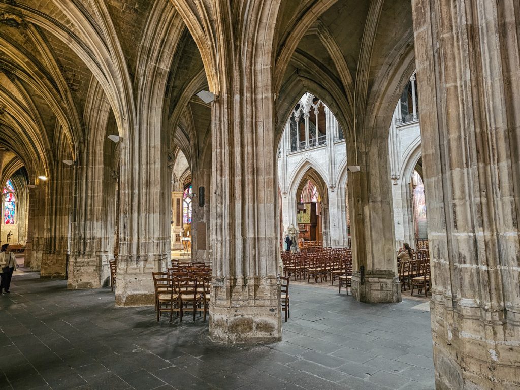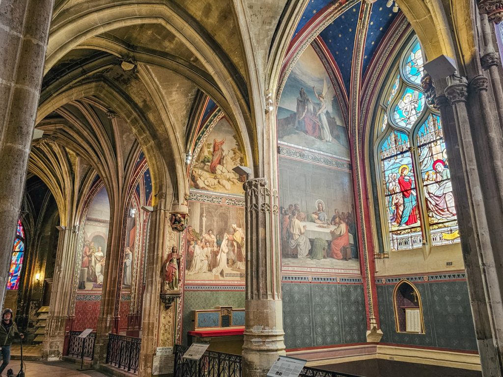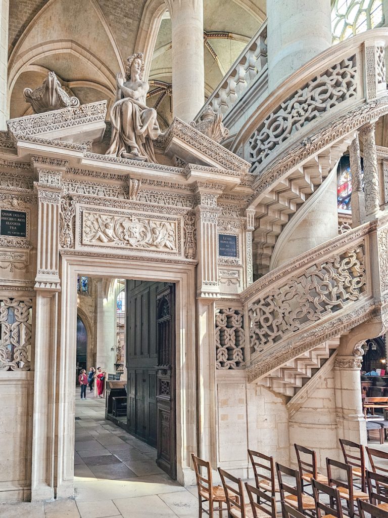 Beyond the gleaming white walls and high vaulted ceilings, the highlight of the church is its elaborate stone rood screen, the only one of its kind still standing in Paris.