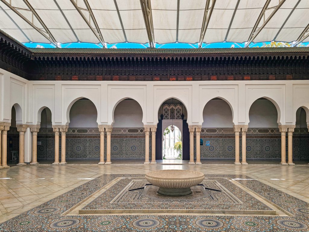 The Grand Mosque of Paris is the largest mosque in France, built in the Moorish Revival style inspired by Andalusia and North Africa. Its symmetrical design, carved stucco archways, colorful mosaics, and central fountain create an atmosphere that feels peaceful and elegant.
