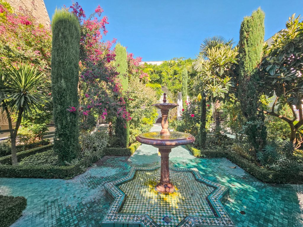 Visitors can explore a few interior rooms, but the highlight is the large courtyard and garden filled with plants, fountains, and a view of the 33-meter-tall minaret.