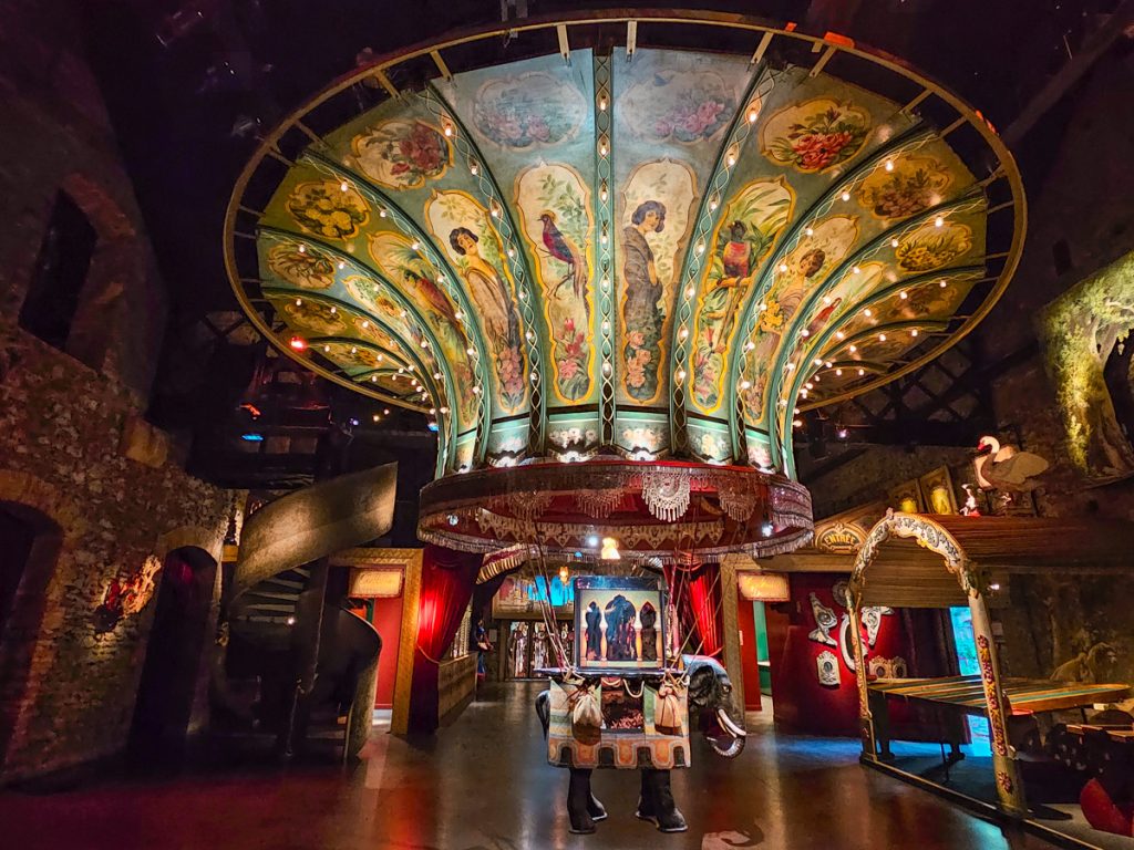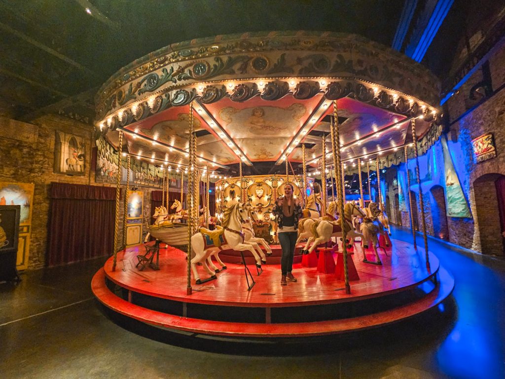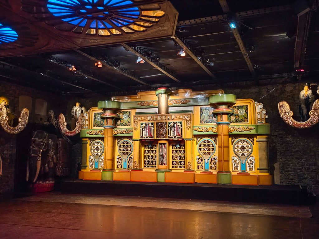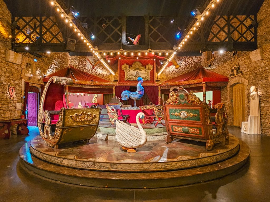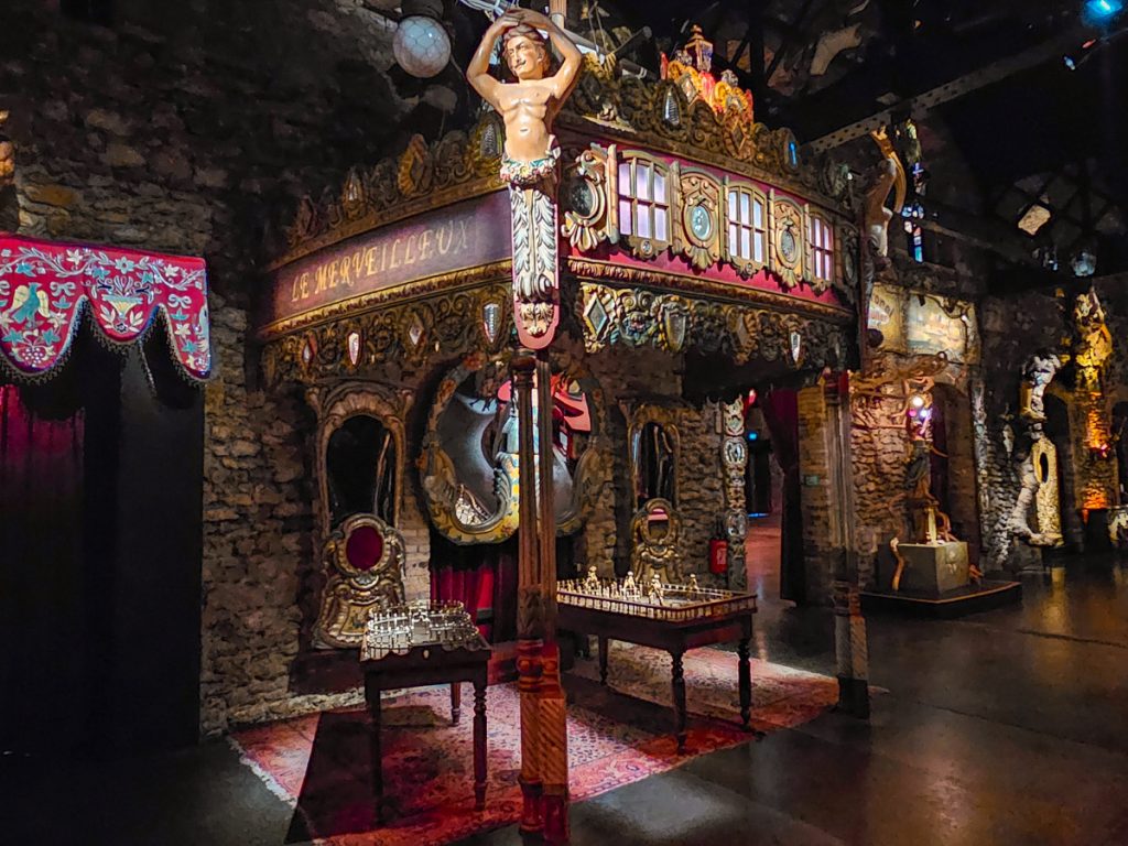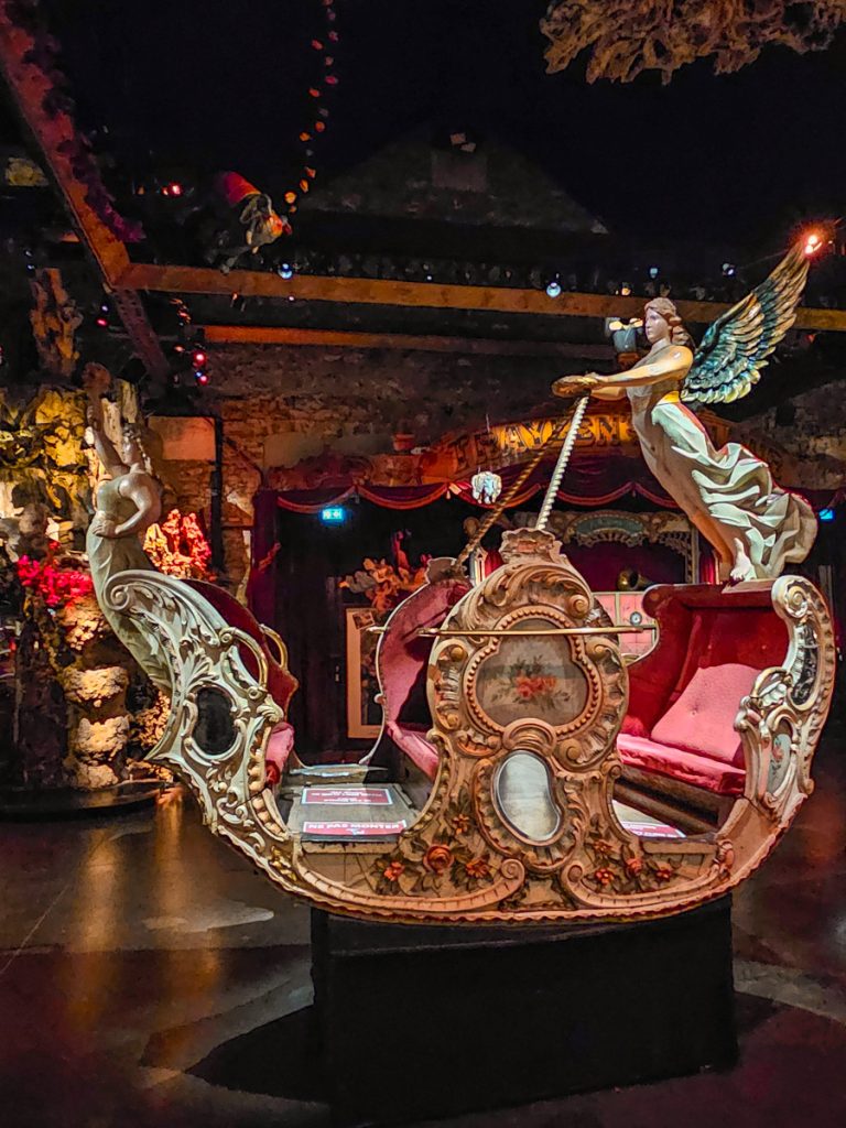 Inside, you’ll see things like fairground organs or and turn-of-the-century games that still work. Decorations fill the walls and corners, including pieces like wooden chariots, or carved horses and mythical creatures.