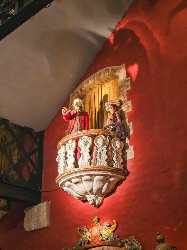 Tucked in the same Venetian hall, animated figures in masks and period costumes perform short opera scenes from small balconies and stages. Each one moves in time to the music, recreating the grandeur of Venetian operas.