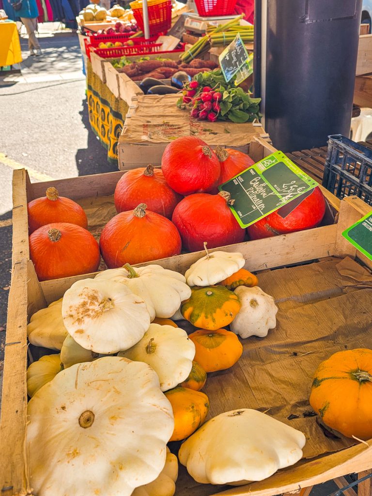 Saturday morning is market day at Place de la Bouteillerie in the lower town, with the hilled city as a backdrop behind the stalls. This is a small, local, authentic market selling regional products, including vegetables, flowers, honey, jam, eggs, cheese, meat, and some clothing.